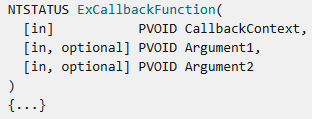 When you want to register a kernel callback routine for a registry operation, you use the CmRegisterCallback NT API function. When you call this function, you must supply a pointer to the RegistryCallback routine you wish to register, which is of the type EX_CALLBACK_FUNCTION.