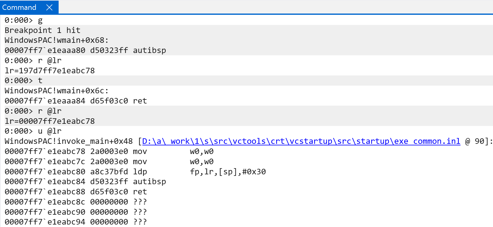 Windows currently offers an implementation of PAC (with the ability to expand in the future). Windows currently supports PAC for signing and authenticating "instruction pointers". The way that this manifests itself, however, really results in the signing of return addresses. On Windows, for both user-mode and kernel-mode ARM64 code, one can specify the /guard:signret(-) compiler flag to either explicitly enable or disable the signing of return addresses. Enabling this flag instruments the pacibsp and autibsp instructions into the prologue and epilogue of each function, which are "PAC" instructions used to both sign and subsequently validate return addresses.